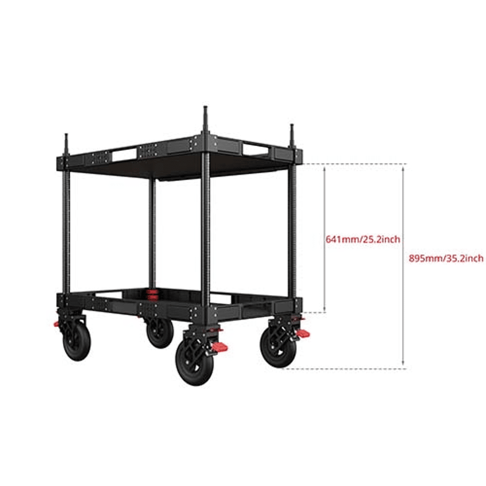 De 20,3 cm stille pneumatische wielen zorgen voor soepele verplaatsing, terwijl de geïntegreerde vergrendeling directe stabiliteit biedt tijdens gebruik. Met een draagvermogen tot 249,9 kg is deze cart geschikt voor zware professionele configuraties en blijft hij toch mobiel en praktisch in gebruik.
