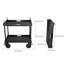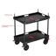 Het dubbele platform biedt veel flexibiliteit: het bovenste niveau is ideaal voor monitoren, laptops, draadloze systemen en voeding, terwijl het onderste platform extra ruimte biedt voor grotere en zwaardere apparatuur. De modulaire opbouw met cheese plates, schroefpunten en baby pins maakt het mogelijk om accessoires zoals monitorarmen, audio-oplossingen, V-mount plates, parasols en andere uitbreidingen te monteren, waardoor de cart inzetbaar is als director station, DIT-werkplek, mobiele edit set of algemene transportoplossing op set.