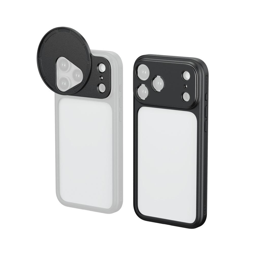 De SmallRig FilMov Bumper Case 5790 voor iPhone 17 Pro is een lichtgewicht fotografiecase die compatibel is met diverse optische accessoires zoals lenzen en filters. Het TPU materiaal biedt een comfortabele grip en basisbescherming, terwijl de geperforeerde backplate uitstekende warmteafvoer biedt. De snelle lens backplate systeem ondersteunt T-Mount lenzen en 67mm filters voor snelle wisselingen.