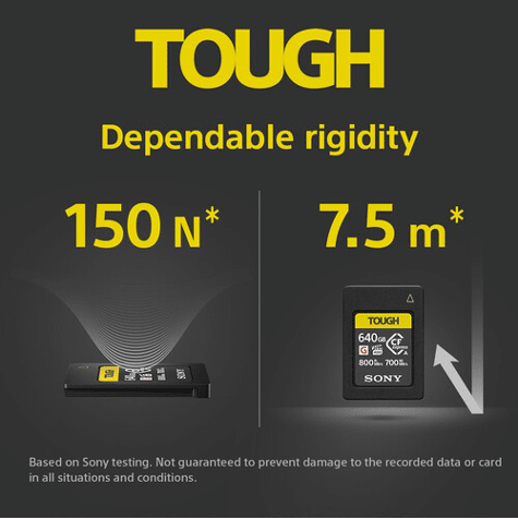 Dankzij Sony's unieke TOUGH-kaartontwerp biedt deze geheugenkaart meer dan tien keer de buigweerstand van de CFexpress Type A-standaard, met extra stijfheid getest tot 150 nW. De harsbehuizing is ook vijf keer schokbestendiger, waardoor hij bestand is tegen vallen tot 7,3 meter.