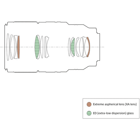 • Geavanceerd optisch ontwerp met 17 elementen in 13 groepen, waaronder twee XA (eXtreme Aspherical) en twee ED (Extra-low Dispersion) glaselementen, die aberraties minimaliseren.